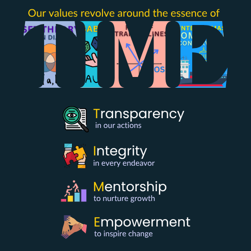 Time is a crucial aspect of our lives, influencing every outcome. Our values, derived from the word TIME, embody our commitment to excellence: Transparency, Integrity, Mentorship & Empowerment.